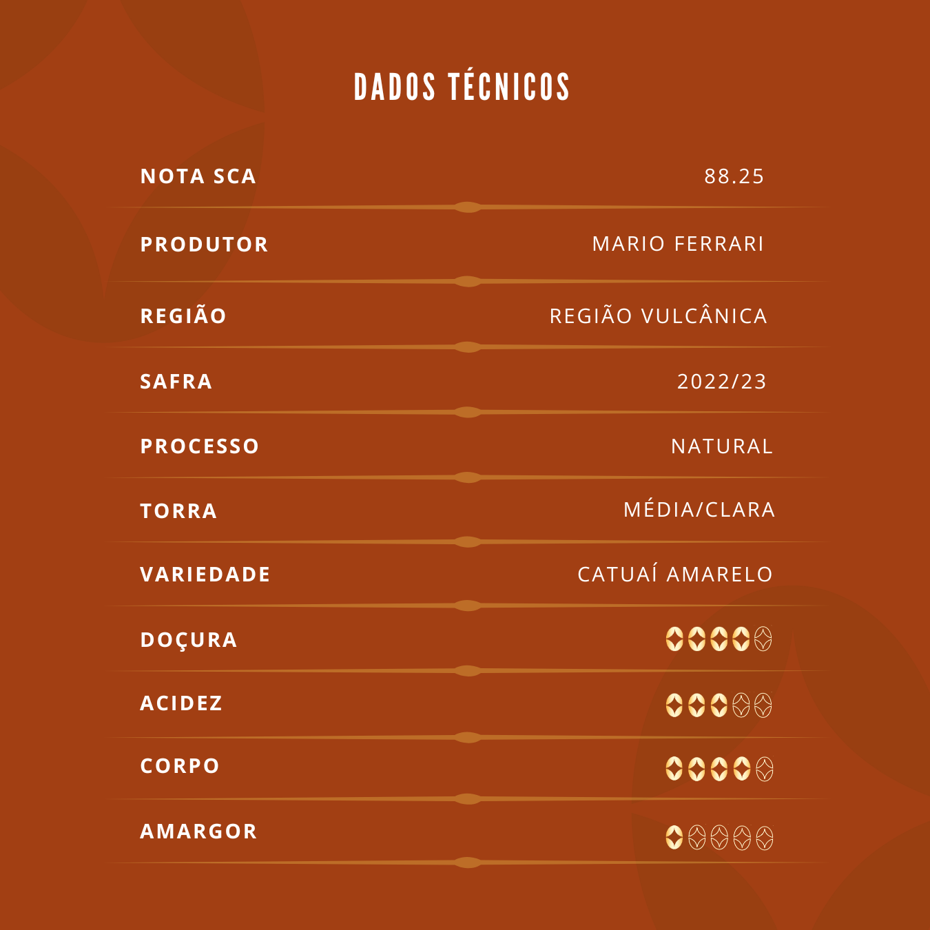 Prepare-se para degustar nuances de frutas amarelas, que se entrelaçam harmoniosamente com a doçura do mel trazendo uma vivacidade e frescor incomparáveis, criando um perfil de sabor complexo e bem equilibrado. Essa combinação de sabores resulta em uma xícara vibrante e memorável, ideal para os apreciadores de café que buscam uma experiência refinada e inesquecível.